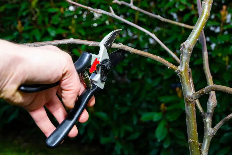 Zorg ervoor dat je scherp en schoon gereedschap gebruikt om infecties te voorkomen. Snijd takken schuin af, net boven een naar buiten gerichte knop, om waterophoping op de snede te voorkomen en een gezonde groei te stimuleren.
