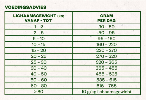 Een jonge, opgroeiende hond heeft meer voeding nodig dan een volwassen hond. Ook de samenstelling van het voer verschilt per leeftijd. Kies je hondenvoer dat specifiek bedoeld is voor de leeftijd van je hond (puppy, adult, senior), dan houdt de voedingstabel rekening met de levensfase van je hond en zit je met de hoeveelheid die vermeld staat dus goed.