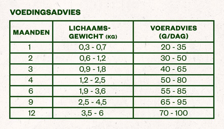 Op alle verpakkingen kittenvoer staat een voedingstabel. Deze tabellen zijn eenvoudig af te lezen. Hierop vind je hoeveel voeding jouw kitten dagelijks mag krijgen op basis van zijn leeftijd en/of gewicht. Hieronder zie je een voorbeeld van zo’n tabel: