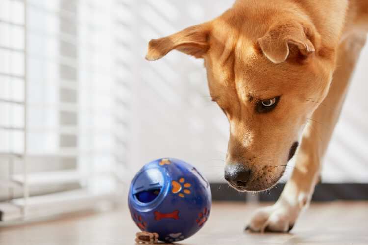 In plaats van het voer simpelweg in een bak te doen, kun je het verstoppen in verschillende hoeken van de kamer of in speciale voerspeeltjes. Stop zijn brokken bijvoorbeeld in een Kong of gebruik een snuffelmat of voerbal. Dit stimuleert het denkvermogen van je hond en helpt verveling te voorkomen. Ook helpt het je hond langzamer te eten, wat vooral handig is voor honden die de neiging hebben om te snel te eten.