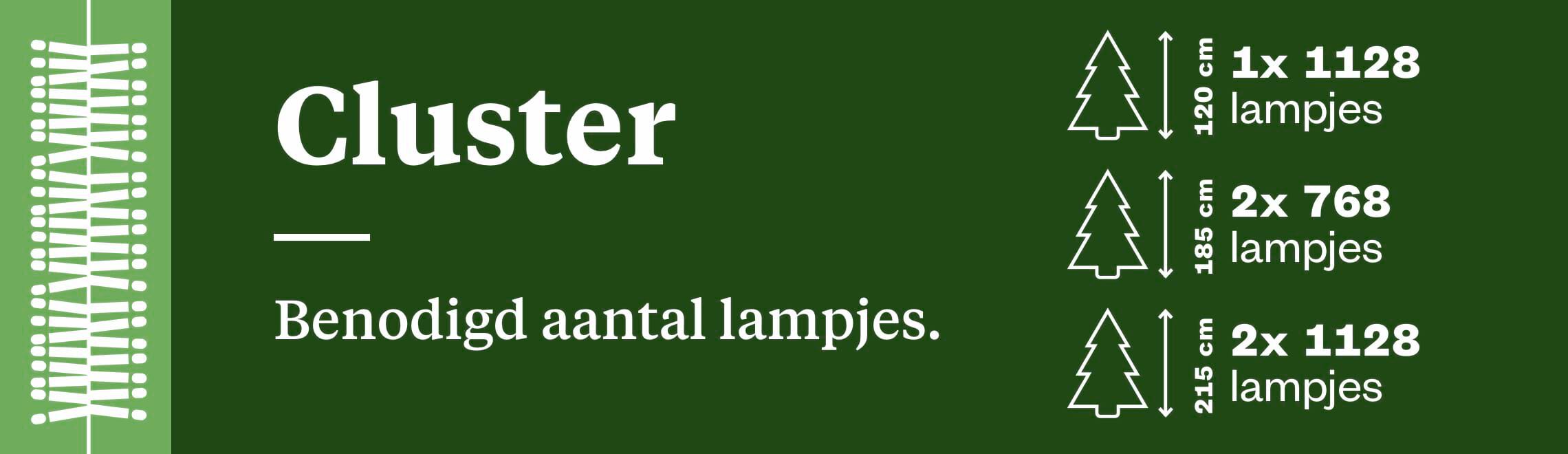 Bij clusterverlichting heb je de meeste lampjes per meter snoer. Dit geeft een vol effect in je boom. Dit type verlichting is wel iets duurder vanwege het hogere aantal lampjes per meter snoer.
