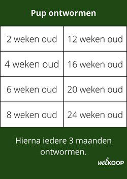 Hierna is het verstandig om je hond eenmaal per 3 maanden te ontwormen. Op deze tabel vind je een handige samenvatting.