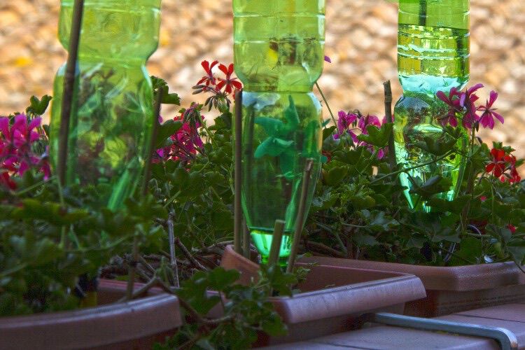 Steek de fles omgekeerd in de grond van je plant. Het water sijpelt langzaam door de gaatjes, waardoor je planten geleidelijk water krijgen.