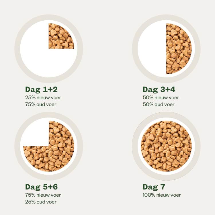 Als je overstapt van voeding, doe dit dan geleidelijk. Neem 7 dagen de tijd. Meng telkens een beetje minder oud voer met iets meer nieuw voer tot je geheel bent overgeschakeld. Zo is de kans dat het spijsverteringssysteem van slag raakt kleiner.