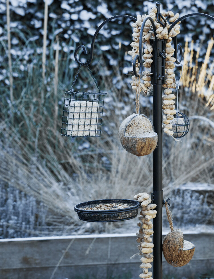 Je kunt het voer ook ophangen aan een boomtak of aan een nestkastje of voederstation. Zo kunnen vogels er gemakkelijk bij. Heb je veel katten in de buurt? Dan is een huisje beter. Zo kunnen vogels het voer veilig opeten. Ook is het voer zo goed beschermd tegen regen en sneeuw.