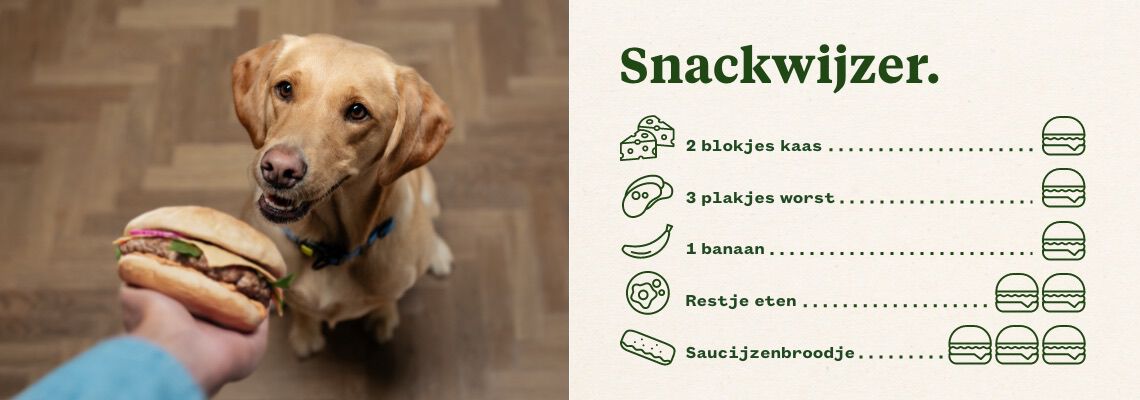 Een 'mensensnack' is in verhouding slechter voor een hond, dan voor een mens. Zo zijn twee blokjes kaas voor je hond als een hamburger voor ons. Onze snackwijzer zet wat voedingsmiddelen op een rijtje.