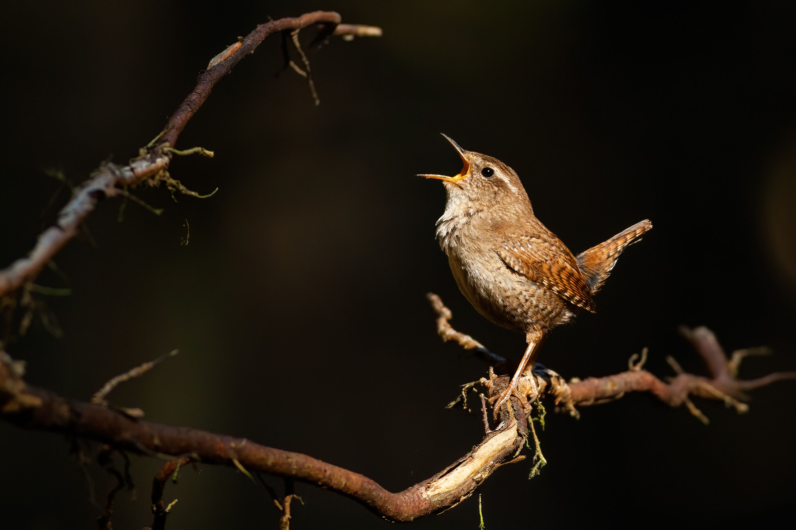 De winterkoning klinkt ongelooflijk luid. Zijn zang bestaat uit snelle, hoge geluidjes die heel hard kunnen klinken voor zo’n klein vogeltje. In de winter blijft hij zingen om zijn territorium te markeren.