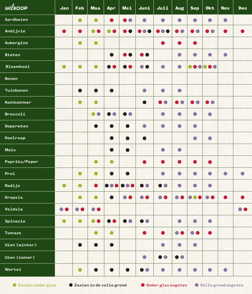 Op de zaaikalender hieronder vind je de zaaimomenten van de populairste groente- en fruitzaden. Dit kan in de kas of in de volle grond. In de kas kan je eerder beginnen met zaaien.