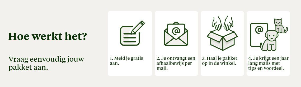 Meld je aan voor ons gratis welkomstpakket en jouw dierspecialist vult een doos met speciaal voor jouw puppy geselecteerde producten. Bovendien krijg je een jaar lang e-mails met tips en voordeel, afgestemd op jouw dier. Zo helpen we je bij het verzorgen van je hond, een leven lang.