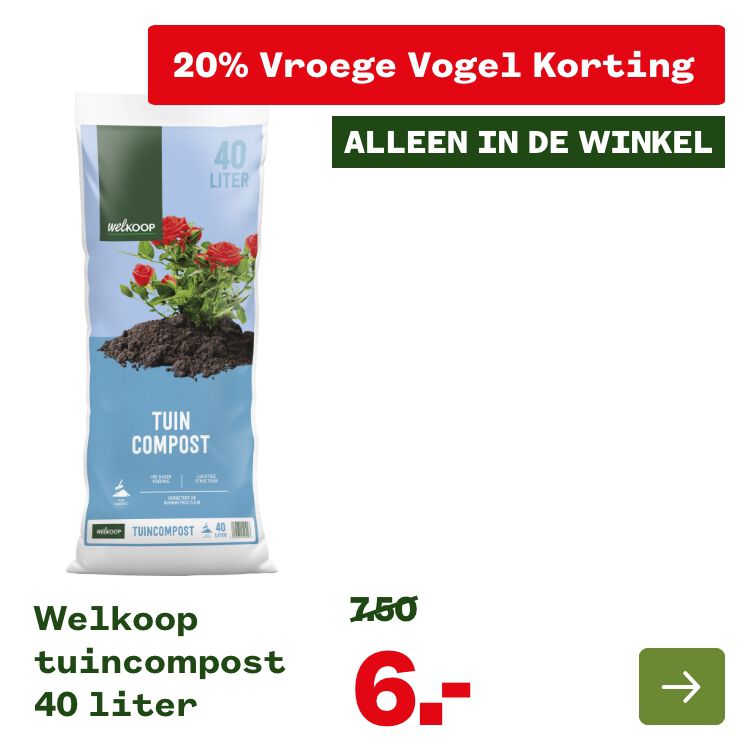 Alle vroege vogels opgelet! Op zaterdag 21 maart profiteer je van 8.00 - 12.00 uur van 20% Vroege Vogel Korting op alles*. Ja, echt waar! Maar let op, deze korting geldt alléén in de winkel. Dus zet je wekker op tijd, kom vroeg uit de veren en vlieg naar jouw nabijgelegen Welkoop winkel.