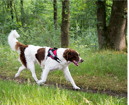 Het tuigje is ergonomisch gevormd. Op geen enkele wijze wordt je hond in zijn beweging beperkt.
