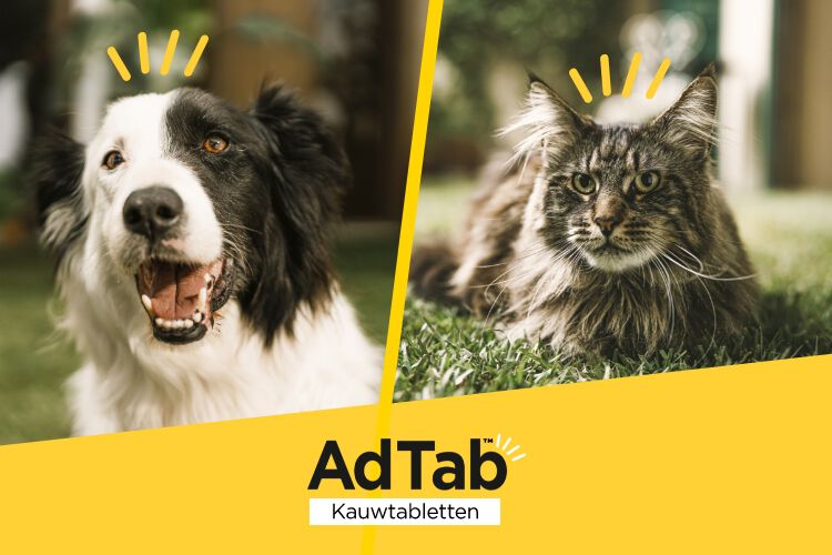 AdTabᵀᴹ is een gearomatiseerde kauwtablet voor honden en katten. De tablet werkt snel en biedt een maand lang bescherming tegen vlooien en teken. Je geeft 'm eenvoudig via het voer. AdTabᵀᴹ is er voor pups vanaf 8 weken en 1,3 kilo. Voor kittens geldt: vanaf 8 weken en 0,5 kilo. De werkzame stof is lotilaner. Die tast het zenuwstelsel van vlooien en teken aan, waardoor ze snel doodgaan. De tablet is grondig getest en ontworpen voor effectief gebruik. Je haalt de tablet zonder recept bij een van onze winkels.